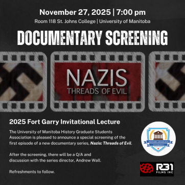 The University of Manitoba History Graduate Students Association is pleased to announce a special screening of the first episode of a new documentary series called, Nazis: Threads of Evil. There will be a Q&A with series director, Andrew Wall, after the screening. Refreshments to follow.